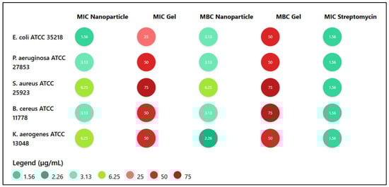The antibacterial efficacy of chitosan–quercetin nanoparticles and their hydrogel formulation was evaluated against five reference bacterial strains by determining the minimum inhibitory concentration (MIC) and minimum bactericidal concentration (MBC), as shown in Figure 4. The nanoparticles exhibited notable antibacterial activity, particularly against Escherichia coli ATCC 35218, with both MIC and MBC values of 1.56 and 3.13 µg/mL, respectively, comparable to the standard antibiotic streptomycin. Pseudomonas aeruginosa and Bacillus cereus were also sensitive to the nanoparticulate formulation (MIC = 3.13 µg/mL; MBC = 3.13 µg/mL), while Staphylococcus aureus and Klebsiella aerogenes required higher MICs (6.25 µg/mL), indicating a moderate antibacterial effect. In contrast, the hydrogel form demonstrated significantly weaker activity across all strains, with MIC values ranging from 25 to 75 µg/mL, suggesting reduced bioavailability or slower release of the active agents. Overall, the nanoparticle formulation showed a stronger and broader antibacterial spectrum compared to the gel, underscoring its potential as an effective antimicrobial agent.