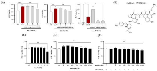 Screening and selection of adhesive peptides and cytotoxicity assessment in HaCaT cells. (A) HaCaT cells were pretreated with the designed adhesive peptides (100 nM) for 2 h and then treated with LL-37 (8 µM) for 24 h. Subsequently, the rosacea inflammation markers (VEGF, IL-6, and TNF-α) were measured by ELISA. (B) The structure of AdhPep3. Cell viability of HaCaT cells treated with different concentrations of (C) LL-37 (1 µM to 20 µM), (D) AdhPep3 (1 nM to 10 µM), and (E) LL37 (8 µM) in combination with different concentrations of AdhPep3 (1 nM to 10 µM). *, p < 0.01; ***, p < 0.001; ##, p < 0.01; ###, p < 0.001; and ####, p < 0.0001 compared to the LL-37 only group, as determined by one-way ANOVA. n.s. indicates no significant difference (p > 0.05).