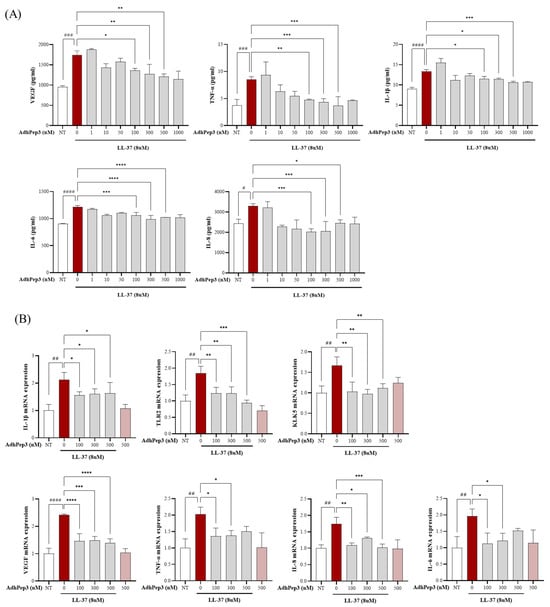 Effect of AdhPep3 on mRNA expression and release of inflammatory and angiogenesis markers in LL37-induced HaCaT cells. HaCaT cells were pretreated with AdhPep3 at different concentrations for 2 h and then treated with LL37 (8 µM) to measure the rosacea markers. (A) The VEGF, TNF-α, IL-1β, IL-6, and IL-8 levels were measured using ELISA. (B) The mRNA levels of VEGF, TLR2, KLK5, IL-1β, TNF-α, IL-6, and IL-8 were measured using RT-qPCR. *, **, ***, and **** indicate p < 0.05, p < 0.01, p < 0.001, and p < 0.0001, respectively, as determined by one-way ANOVA. #, ##, ###, and #### indicate p < 0.05, p < 0.01, p < 0.001, and p < 0.0001 for comparisons with the group treated with LL-37 alone.