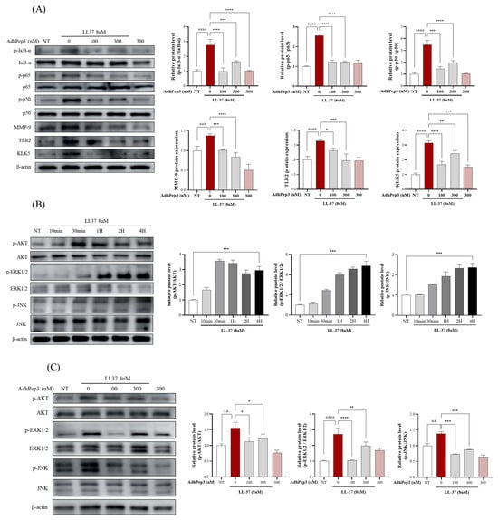 Previous studies have shown that TLR2 is overexpressed in the skin of patients with rosacea. TLR-2 activation upregulates LL-37 expression, which further activates the NFκB, MAPK, and PI3K-Akt signaling pathways to promote proinflammatory cytokine secretion and angiogenesis [,,,]. Therefore, we analyzed the expression of the rosacea-related proteins using Western blotting. The results showed that LL-37 (8 µM) induced the overexpression of several rosacea markers, including TLR2, MMP9, and KLK5. However, the expression of these markers was significantly suppressed in the cells pretreated with AdhPep3 (Figure 3A). Moreover, LL-37 induced excessive phosphorylation of p65, p50, and IκB-α, which was found to be significantly mitigated in the AdhPep3 pretreatment group. Furthermore, the time points at which AKT, JNK, and ERK were most actively phosphorylated following LL-37 treatment were analyzed using Western blotting. ERK and JNK were actively phosphorylated up to 4 h after LL-37 treatment. AKT phosphorylation was most active at 30 min and remained active after 4 h (Figure 3B). Therefore, the phosphorylation profile of these proteins 4 h after LL-37 and AdhPep3 treatment indicated that the phosphorylation of AKT/ERK/JNK was attenuated in the AdhPep3-treated cells compared to those treated with LL-37 only (Figure 3C).