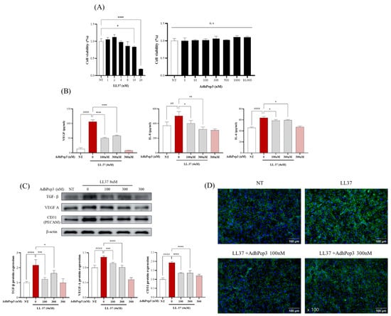 The anti-angiogenic effect of AdhPep3 in the LL-37-stimulated HUVECs was analyzed by evaluating the cytokines, chemokines, and angiogenesis markers using ELISA, Western blotting, and ICC. The ELISA results showed that cells treated with 4 µM LL-37 exhibited significantly increased levels of VEGF, IL-8, and IL-6, which are angiogenesis-related cytokines and chemokines. Their levels were mitigated after pretreatment with AdhPep3 (100 nM and 300 nM) (Figure 4B). Western blotting results showed that LL-37-treated cells overexpressed the angiogenesis markers TGF-β, VEGF-A, and CD31, while the pretreatment with AdhPep3 significantly reduced their expression levels (Figure 4C). Additionally, ICC analysis revealed that CD31 was overexpressed at the junctions between the LL-37-treated HUVECs, as shown by the strong fluorescence intensity. However, cells pretreated with AdhPep3 exhibited lower fluorescence intensity, indicating that CD31 expression was significantly reduced (Figure 4D). These results indicate that AdhPep3 attenuates angiogenesis in LL-37-induced HUVECs.