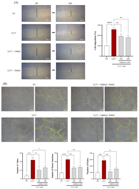 Effect of AdhPep3 on migration and tube formation in LL37-induced human umbilical vein endothelial cells. To evaluate migration and tube formation, HUVECs were treated with LL-37 (4 μM) and AdhPep3 (100 nM, 300 nM) and observed for 16 h to 24 h. The cell migration and tube formation ability of the HUVECs were evaluated using the (A) scratch migration and (B) tube formation assays, respectively. *, **, and *** indicate p < 0.05, p < 0.01, and p < 0.001, respectively, as determined by one-way ANOVA. ### and #### indicate p < 0.001 and p < 0.0001 for comparisons with the group treated with LL-37 alone.
