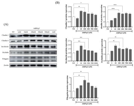 Effect of AdhPep3 on the expression of proteins related to tight junctions and the skin barrier in HaCaT cells. HaCaT cells were treated with AdhPep3 (1 nM to 1 µM), and 24 h later, the expression of tight junction- and skin barrier-related proteins was measured. (A) Western blotting analysis and (B) quantification of the Claudin-1, Claudin-4, Involucrin, Filaggrin, and Occludin levels. *, **, ***, and **** indicate p < 0.05, p < 0.01, p < 0.001, and p < 0.0001, respectively, as determined by one-way ANOVA.