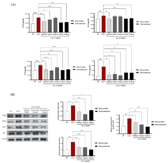 Comparison of the rosacea treatment effects of doxycycline, metronidazole, and AdhPep3 on LL-37-Induced HaCaT Cells. HaCaT cells were treated with AdhPep3 (300 nM), doxycycline (2 µg/mL, 20 µg/mL), and metronidazole (2 µg/mL, 20 µg/mL) for 2 h, followed by treatment with LL37 (8 µM), and rosacea markers were measured. (A) VEGF, IL-6, IL-8, and TNF-α levels were measured by ELISA. (B) Protein expression levels of TLR2, KLK5, and NF-κB (p65, p-p65) were measured by Western blotting. *, **, ***, and **** indicate p < 0.05, p < 0.01, p < 0.001, and p < 0.0001, respectively, as determined by one-way ANOVA. ##, ###, and #### indicate p < 0.05, p < 0.01, p < 0.001, and p < 0.0001 for comparisons with the group treated with LL37 alone.