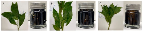 Visual appearance of the three types of crude extracts and their corresponding fresh leaves from Prunus species: (A) P. domestica (EL), (B) P. salicina (JL), and (C) P. cerasifera (CL). All extracts displayed a dark green color and were obtained via ethanolic extraction.