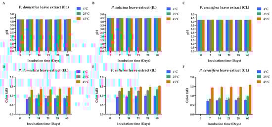 Physicochemical characteristics of the Prunus species leaf extracts (EL, JL, and CL) during storage at 4 ± 2 °C, 25 ± 2 °C, and 45 ± 2 °C over 60 days. (A–C) show the pH profiles of EL, JL, and CL, respectively. (D–F) display the color variation (∆E) for the same extracts under identical conditions. Each bar represents the mean ± SD of triplicate measurements.