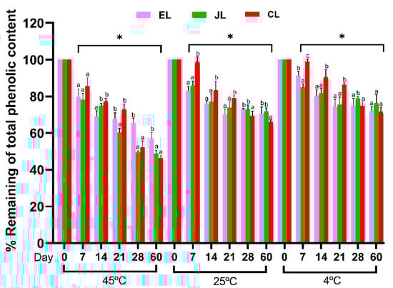 Stability of TPC in EL, JL, and CL after storage at different temperatures (4 ± 2 °C, 25 ± 2 °C, and 45 ± 2 °C) over 60 days. The data is expressed as the percentage remaining relative to the initial value (day 0). Different letters (a, b, c) indicate statistically significant differences among extracts at the same time point and storage condition (ANOVA with Tukey’s HSD, p < 0.05). Asterisks (*) denote significant differences compared to day 0 within the same extract and temperature condition (p < 0.05).
