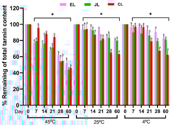 Stability of TTC in EL, JL, and CL after storage at different temperatures (4 ± 2 °C, 25 ± 2 °C, and 45 ± 2 °C) over 60 days. The data is expressed as the percentage remaining compared to the initial value (day 0). Different letters (a, b) denote statistically significant differences among extracts at the same time point and temperature (ANOVA with Tukey’s HSD, p < 0.05). Asterisks (*) indicate significant differences compared to day 0 within the same extract and storage condition (p < 0.05).