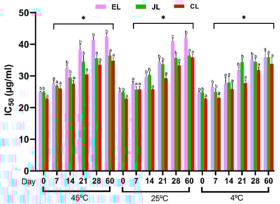 Stability of antioxidant activity (DPPH assay) in EL, JL, and CL after storage at 4 ± 2 °C, 25 ± 2 °C, and 45 ± 2 °C over a period of 60 days. The data is expressed as IC50 (μg/mL) and different letters (a, b, c) represent statistically significant differences among extracts at the same time point and storage condition (ANOVA with Tukey’s HSD, p < 0.05). Asterisks (*) indicate significant differences compared to day 0 within the same extract and storage condition (p < 0.05).