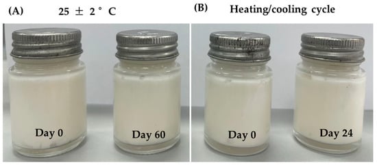 Organoleptic and physical characteristics, including color, odor, phase separation, homogeneity, pH, and viscosity, were assessed visually and manually by checking the texture and consistency of the cream. Acceptable limits for stability were defined based on established guidelines and included no significant changes in color or odor and the absence of phase separation [].