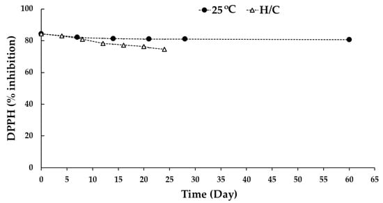 Antioxidant activity of CCL during storage. Antioxidant activity, measured as % DPPH inhibition, was evaluated over time under two conditions: (1) ambient storage at 25 ± 2 °C on Days 0, 7, 14, 21, 28, and 60, and (2) thermal stress via a heating/cooling (H/C) cycle consisting of alternating 48 h periods at 45 ± 2 °C and 4 ± 2 °C, assessed on Days 0, 4, 8, 12, 16, 20, and 24.