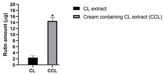 Comparison of rutin retention within a synthetic membrane after 8 h between the 0.3% w/w CL solution and the CCL. Results are expressed as means ± SD (n = 3). Asterisk (*) indicates a statistically significant difference between the groups (p < 0.05), with the CCL formulation showing significantly higher rutin retention than the aqueous extract alone.