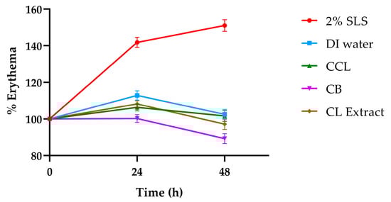 Changes in skin erythema (%) over time after patch removal. The percentage of skin erythema was measured at baseline (day 0) and at 24 h and 48 h post-removal in volunteers exposed to patches containing five different test substances: 2% w/w sodium lauryl sulfate (SLS) as a positive control, deionized water (DI water) as a negative control, cream containing P. cerasifera extract (CCL), cream base (CB), and Prunus cerasifera (CL) extract. Data are expressed as means ± standard deviation (n = 26).