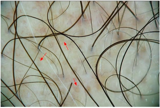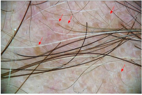- Kuczara, A.; Waśkiel-Burnat, A.; Rakowska, A.; Olszewska, M.; Rudnicka, L. Trichoscopy of Androgenetic Alopecia: A Systematic Review. J. Clin. Med. 2024, 13, 1962. [Google Scholar] [CrossRef] [PubMed]