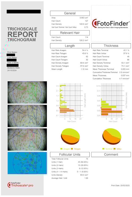 These measures were obtained using a digital dermatoscope (Fotofinder Systems, Bad Birnbach, Germany, Fotofinder ATBM II) under standardized lighting and magnification conditions. After each performed investigation, a trichologic report containing several measured parameters was generated (Figure 3).