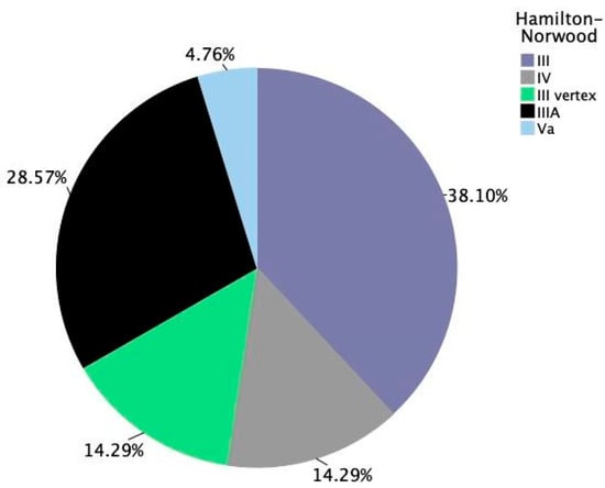 Distribution of androgenetic alopecia severity among male participants. Hamilton–Norwood staging across all male subjects at baseline (n = 21).