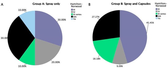 (A) Stratification of androgenic alopecia severity for male participants in treatment group A (spray only). (B) Stratification of androgenic alopecia severity for male participants in treatment group B (spray and capsules).