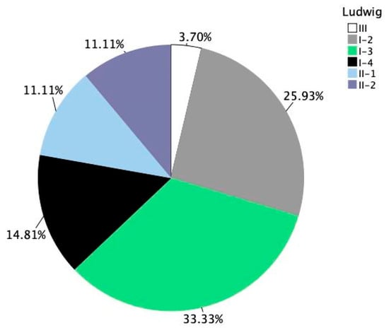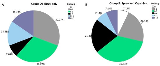 In comparison, the Spray + Capsules group (Group B) showed a slightly wider spread. Ludwig I-3 remained the most prevalent (35.71%), followed by I-2 and I-4 (both at 21.43%). Lower severity stages like II-1, II-2, and stage III each represented 7.14% of the group (Figure 7B).