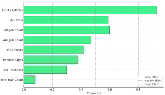 Effect size analysis using Cohen’s d revealed variable magnitudes of change across the eight trichologic parameters following 3 months of treatment (Figure 8). The most substantial improvement was observed in the reduction inempty follicles (d = −0.91), indicating a large effect and suggesting a meaningful increase in follicular activity. Medium-to-large effects were also seen in the decrease intelogen-phase hairs (d = 0.60) and the increase in the anagen/telogen ratio (d = 0.59), both consistent with improved follicular cycling. Moderate improvements were found in anagen hair count (d = 0.48), hair density (d = 0.41), and peripilar signs (d = 0.39). Hair shaft thickness showed a small-to-moderate effect (d = 0.30), while total hair count exhibited only a negligible change (d = 0.08).