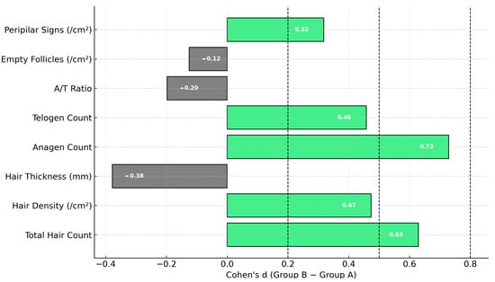 Cohen’s d effect sizes comparing treatment groups for trichologic parameters. Light green bars represent positive effects favoring Group B, while gray bars indicate effects favoring Group A. Vertical dashed lines denote thresholds for small (0.2), medium (0.5), and large (0.8) effects.