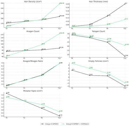 Model-based extrapolation of trichoscopic parameter evolution over 12 months demonstrated distinct response profiles between the two treatment groups. Group B (spray plus capsules) showed steeper and sustained improvements in hair density, hair thickness, anagen count, and anagen/telogen ratio, particularly evident from 6 to 12 months (extrapolated data). Group A (spray only) exhibited more modest gains across these domains but showed comparable reductions in telogen count, empty follicle presence, and peripilar signs. These trends suggest that while both treatments improved follicular health, the combined regimen elicited a more robust and multidimensional response over time (Figure 10).