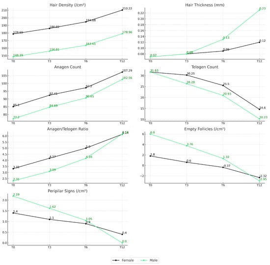 Sex-stratified analysis (Figure 11) revealed distinct trends in trichologic parameter evolution between male and female participants. Across nearly all domains, females demonstrated more stable and progressive improvements, particularly in hair density (T0: 177.95 to T12: 210.22), anagen count (88.15 to 107.29), and reduction in telogen count (36.25 to 14.26). Males also showed gains in hair growth parameters, but with more pronounced increases in shaft thickness (0.0589 mm to 0.2265 mm) and greater reductions in empty follicle count (6.00 to 2.95). Both groups improved their anagen/telogen ratio over time, though females reached slightly higher values at T12. The reduction in peripilar signs was consistent across sexes, with males reaching negative values by T12, suggesting potential resolution of perifollicular inflammation.