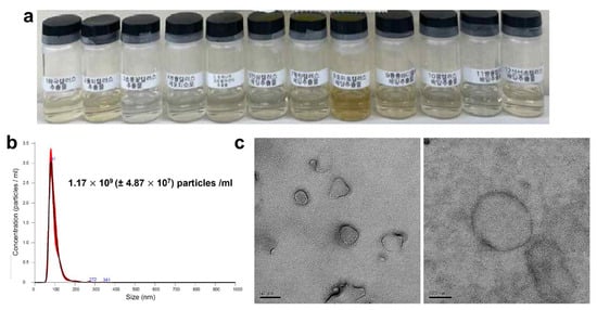 All samples listed in Table 3 were produced by our laboratory. Some of these samples had already undergone testing and have been included in previously submitted or published manuscripts. Others represent earlier developments that had successfully passed preliminary evaluations (Figure 1a). Based on this, a subset of the remaining samples was randomly selected for further assessment, including fundamental analyses, such as cell viability, wound healing, and primary irritant patch testing. The samples that had already been published, mentioned, or previously studied are appropriately cited in the present manuscript. The samples used for each assay were as follows: cell viability—Nos. 7, 12, 27, 28, 33, 34, 35, 38, 41, 42, 43, 45, and 48 (Figure 2); wound healing—Nos. 28, 33, 34, 35, 38, 41, 42, 43, 45, and 48 (Figure 3); and immunocytochemistry—Nos. 33, 34, 35, 38, 41, 42, 43, 45, and 48 (Figure 4). The number of samples selected for each assay varied due to differences in the experimental objectives, sample availability, and material constraints. Some samples were excluded from specific assays either because they had already been evaluated in previous studies or were reserved for future research. Moreover, certain tests, such as immunocytochemistry, required stricter quality or concentration standards, which further limited the number of applicable samples. Sample Nos. 30 and 31 were used in a previous study [23]. To maintain their integrity and freshness, exosomes were freshly isolated and promptly utilized after extraction, either under refrigerated or frozen conditions. Samples Nos. 26, 27, 28, and 29 represent exosomes extracted from plant callus culture media, as indicated in Table 3. Following extraction, the presence and concentration of these exosomes were confirmed using NTA, with the average particle count calculated as 1.17 × 109 ± 4.87 × 107 particles/mL (Figure 1b). Additionally, the presence of exosomes was further verified through TEM (Figure 1c).