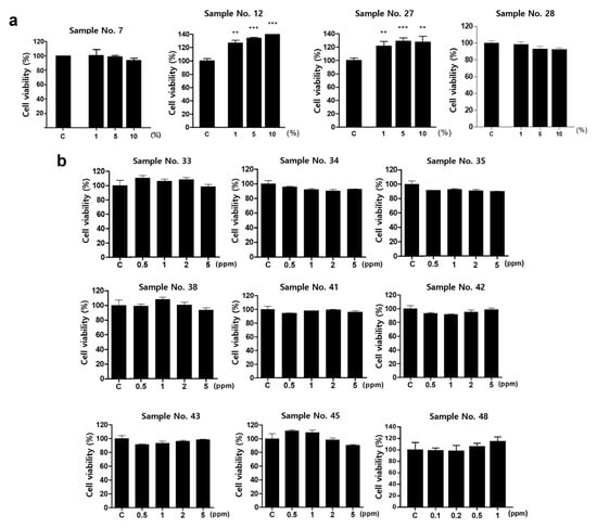 Toxicity evaluations of plant-derived materials conducted via cell viability assessments. (a) Cell viability results for keratinocytes treated with samples Nos. 7, 12, 27, and 28. These samples correspond to, in order, Camellia japonica phytoplacenta extract, Glycine max callus culture extract, Centella asiatica callus extracellular vesicles, and Glycine max callus extracellular vesicles. (b) Cell viability results for keratinocytes treated with samples Nos. 33, 34, 35, 38, 41, 42, 43, 45, and 48, which correspond to, in order, Brassica oleracea Sodium DNA, Camellia japonica Sodium DNA, Centella asiatica Sodium DNA, Houttuynia cordata Sodium DNA, Melaleuca alternifolia Sodium DNA, Morinda citrifolia Sodium DNA, Narcissus tazetta Sodium DNA, Panax ginseng Sodium DNA, and Rosa damascena (callus) Sodium DNA. Sodium DNA is listed as an official name in the International Nomenclature of Cosmetic Ingredients. Asterisks above the bars indicate statistical significance, as follows: p < 0.01 (**), and p < 0.001 (***).