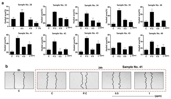 Wound-healing assay of keratinocytes treated with plant-derived materials (PDMs). Twenty-four hours after seeding, the keratinocytes were scratched using a scratcher and subsequently treated with PDMs (samples Nos. 28, 33, 34, 35, 38, 41, 42, 43, 45, and 48). The cells were then incubated for an additional 24 h. (a) The healed area was quantitatively analyzed. (b) Representative images of wound closure are visualized. The PDMs, in order of the sample number, correspond to Glycine max callus extracellular vehicles, Brassica oleracea Sodium DNA, Camellia japonica Sodium DNA, Centella asiatica Sodium DNA, Houttuynia cordata Sodium DNA, Melaleuca alternifolia Sodium DNA, Morinda citrifolia Sodium DNA, Narcissus tazetta Sodium DNA, Panax ginseng Sodium DNA, and Rosa damascena (callus) Sodium DNA. Sodium DNA is recognized as an official name in the International Nomenclature of Cosmetic Ingredients. Asterisks above the bars indicate statistical significance, as follows: p < 0.05 (*), p < 0.01 (**), and p < 0.001 (***).