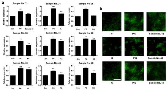 Although cell viability and wound-healing assays provide morphological information, they are limited in their ability to assess molecular changes. To further investigate the effects at the protein level, we performed immunocytochemistry to evaluate the expression of FLG, a key protein involved in skin barrier function and integrity. All tested samples, except for sample No. 35, showed a significantly increased FLG fluorescence in-tensity compared with that of the control (p < 0.001; Figure 4a). As shown in Figure 4b, representative fluorescence images of samples Nos. 42, 43, and 48 highlight the differential expression levels of FLG. Collectively, these findings indicate that the selected samples not only maintained or enhanced cellular morphology but also exerted beneficial effects at the molecular level.