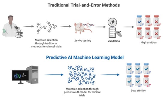 Traditional trial-and-error versus AI-driven predictive approaches in cosmetic formulation: (Above), the conventional method relies on empirical molecule selection, in vivo testing, and sequential validation steps, often resulting in high attrition rates and extended development timelines. (Beneath), the AI-based workflow employs predictive modeling and machine learning to identify promising compounds in silico, reducing experimental burden and increasing formulation efficiency with lower attrition. Created in BioRender. Di Guardo, A. (2025) https://BioRender.com/8breoi4, accessed on 1 July 2025.