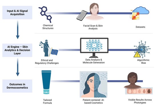 Schematic representation of an AI-driven model for personalized cosmetics formulation. The illustration is structured in three levels: input data acquisition (facial imaging, chemical structures, and cloud-based health records); analytical and algorithmic processing with emphasis on transparency, regulatory compliance, and bias detection; and output generation, including customized formulations. Created in BioRender. Di Guardo, A. (2025) https://BioRender.com/l36ic8l, accessed on 1 July 2025.