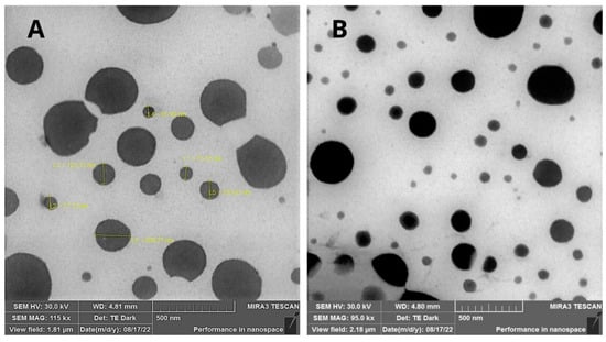 The morphological and superficial evaluation of the samples was carried out using a MYRA 3 LMH scanning electron microscope (Tescan, Brno, Czech Republic) with field emissions. Firstly, 1 mL of nanocapsules suspension (NCBSO) was diluted in 9 mL of ultrapure water in the proportion of 1:10 (v/v). This solution was kept under magnetic stirring for 30 min at room temperature (Fisatom, model 752A, São Paulo, Brazil). Then, the 10 mL of the solution was mixed in equal parts with 1% (w/v) solution of phosphotungstic acid. The mixture was kept under magnetic stirring for 30 min. A 5 μL aliquot of the final suspension was deposited onto a 200-mesh copper TEM grid coated with carbon film, followed by air-drying at room temperature (25 ± 2 °C) for 24 h. The grid was examined under a microscope (Tescan, Mira 3, Brno, Czech Republic) operated at an accelerating voltage of 30 to 300 kV.