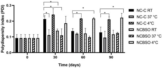Stability results of NC-C (control nanocapsules) and NCBSO (blackberry seed oil-loaded nanocapsules) evaluated by the polydispersity index (PDI) under 4 °C, room temperature (RT), and 37 °C (* p < 0.05).