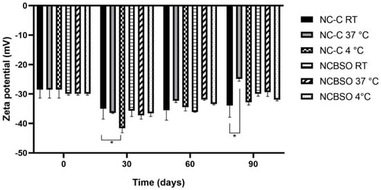 Stability results of the NC-C (control nanocapsules) and NCBSO (blackberry seed oil-loaded nanocapsules) depending on the zeta potential (mV) under 4 °C, room temperature (RT), and 37 °C (* p < 0.05).
