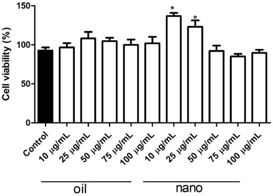 Figure 4 shows the MTT assay results. At the tested concentrations (10, 25, 50, 75, and 100 μg.mL−1), BSO and NCBSO presented no cytotoxic effect to the human fibroblast cell line CCD1072Sk. According to the ISO 10993-5:2009 standard [], a product is considered cytotoxic when cell viability is reduced to less than 70%, which was not observed in this study. In particular, NCBSO not only prevented cytotoxicity but also induced a significant increase in cell viability at concentrations of 10 and 25 μg.mL−1 (p < 0.05) by providing a cytoprotective effect [,,]. The observed increase in cell viability with NCBSO can be attributed to the controlled release and antioxidant potential of bioactive compounds from BSO, resulting in lower cytotoxicity. Thus, BSO nanoencapsulation offers an actual, sustainable, and innovative approach to enhancing the safety of fatty oils in cosmetic and pharmaceutical contexts.