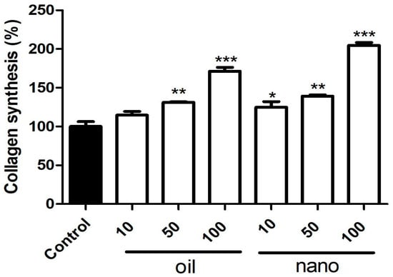 The impact of BSO and NCBSO on collagen production in CCD1072Sk cells was positive, as shown in Figure 5. NCBSO exhibited a more pronounced effect at 10, 50, and 100 µg.mL−1, suggesting that nanoencapsulation enhances this desirable collagen-stimulating property of BSO. The results reveal a dose-dependent increase in collagen production following treatment with both BSO and NCBSO compared to the negative control (Figure 5). At the highest concentration tested (100 µg.mL−1), BSO and NCBSO induced a significant elevation in collagen production by 170% and 200% compared to untreated cells (p < 0.01), respectively. In particular, NCBSO significantly enhanced collagen production compared to free BSO at 100 µg·mL−1 (p < 0.05), leading to improved collagen-boosting performance.