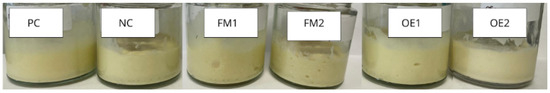 Visual appearance of the six developed oil-in-water (O/W) emulsions after preparation. NC—negative control formulation (no additives); PC—positive control formulation, containing synthetic antioxidant and preservative; FM1—formulation containing 2% of microencapsulated L. origanoides essential oil; FM2—formulation containing 4% of microencapsulated L. origanoides essential oil; OE1—formulation containing 0.85% of L. origanoides essential oil; OE2—formulation containing 1.5% of L. origanoides essential oil.