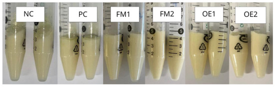 Centrifuge test of the six cosmetic cream formulations. NC—negative control formulation (no additives); PC—positive control formulation, containing synthetic antioxidant and preservative; FM1—formulation containing 2% of microencapsulated L. origanoides essential oil; FM2—formulation containing 4% of microencapsulated L. origanoides essential oil; OE1—formulation containing 0.85% of L. origanoides essential oil; OE2—formulation containing 1.5% of L. origanoides essential oil.