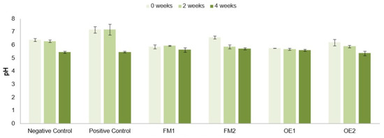 pH of the cosmetic formulations during the established testing period. NC—negative control formulation (no additives); PC—positive control formulation, containing synthetic antioxidant and preservative; FM1—formulation containing 2% of microencapsulated L. origanoides essential oil; FM2—formulation containing 4% of microencapsulated L. origanoides essential oil; OE1—formulation containing 0.85% of L. origanoides essential oil; OE2—formulation containing 1.5% of L. origanoides essential oil.