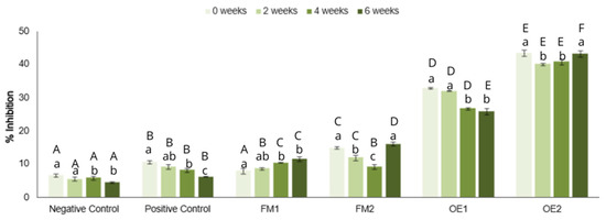 Quantification of the antioxidant potential of the formulations by the DPPH method. NC—negative control formulation (no additives); PC—positive control formulation, containing synthetic antioxidant and preservative; FM1—formulation containing 2% of microencapsulated L. origanoides essential oil; FM2—formulation containing 4% of microencapsulated L. origanoides essential oil; OE1—formulation containing 0.85% of L. origanoides essential oil; OE2—formulation containing 1.5% of L. origanoides essential oil. Different lowercase letters indicate statistically significant differences between time points within the same formulation, while uppercase letters indicate significant differences between formulations at the same time point. Statistical differences were assessed by two-way ANOVA followed by Tukey’s post hoc test (p < 0.05).