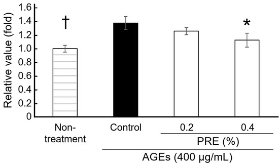 3.1. PRE Inhibits the AGE–RAGE Interaction