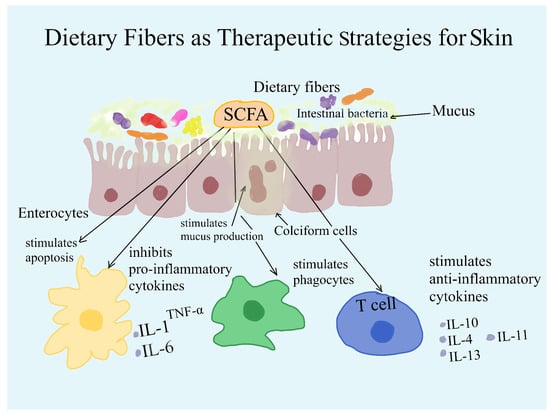 Dietary Fibers as Therapeutic Strategies for Skin: As prebiotics, dietary fibers support good gut bacteria that generate short-chain fatty acids (SCFAs), which have anti-inflammatory properties. These SCFAs strengthen the intestinal barrier, reducing systemic inflammation and potentially alleviating skin disorders.