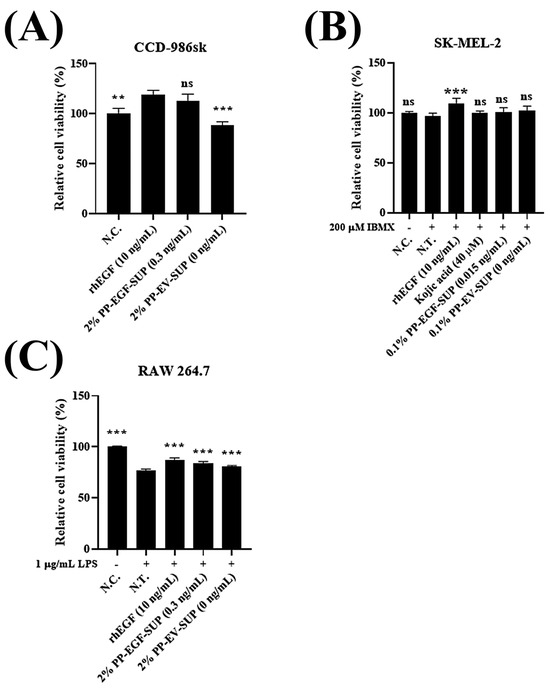Toxicity test of PP-EGF-SUP. The effect of PP-EGF-SUP on the proliferation of each cell line was evaluated using a cell viability analysis, which was performed using the MTT (WST-8) technique. (A) The fibroblast (CCD-986sk) cell line was treated with various EGF protein concentrations, namely, rhEGF at 10 ng/mL, 2% PP-EGF-SUP, and 2% PP-EV-SUP, for 3 days. The actual EGF content in 2% PP-EGF-SUP was 0.3 ng/mL, and no serious cytotoxicity was confirmed in any of the tests. All data are presented as the mean ± SEM of three independent experiments (n = 3). ns, not significant; ** p < 0.001, *** p < 0.001 vs. rhEGF. (B) The skin melanoma (SK-MEL-2) cell line was treated with various EGF protein concentrations, namely, rhEGF at 10 ng/mL, 0.1% PP-EGF-SUP, and 0.1% PP-EV-SUP, for 1 day. The actual EGF content in 0.1% PP-EGF-SUP was 0.015 ng/mL, and no serious cytotoxicity was confirmed in any of the tests. Additionally, 40 µM kojic acid was used as a positive agent in a tyrosinase inhibition assay, and 200 µM IBMX was used as an inducer of tyrosinase expression. No serious cytotoxicity was confirmed in any of the tests. All data are presented as the mean ± SEM of three independent experiments (n = 3). ns, not significant; *** p < 0.001 vs. N.T. (C) The macrophage (RAW 264.7) cell line was treated with various EGF protein concentrations, namely, rhEGF at 10 ng/mL, 2% PP-EGF-SUP, and 2% PP-EV-SUP, for 1 day. The actual EGF content in 2% PP-EGF-SUP was 0.3 ng/mL, and no serious cytotoxicity was confirmed in any of the tests. All data are presented as the mean ± SEM of three independent experiments (n = 3). *** p < 0.001 vs. rhEGF.