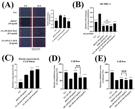 EGF-derived bioactivities: cell scratch wound healing, tyrosinase inhibition, and skin barrier improvement (elastin expression stimulation and collagenase and elastase suppression). To determine whether PP-EGF-SUP demonstrated EGF-derived bioactivities, the wound healing, whitening, and anti-wrinkle properties of PP-EGF-SUP were confirmed using cell scratch wound healing, tyrosinase inhibition, elastin expression, collagenase inhibition, and elastase inhibition assays. (A) In the cell scratch wound healing assay using the CCD-986sk cell line, the cells were treated with various EGF protein concentrations, namely, rhEGF at 10 ng/mL, 2% PP-EGF-SUP, and 2% PP-EV-SUP, after scratching, and then the migrated cell number was counted after 1 day. The actual EGF protein content in 2% PP-EGF-SUP was 0.3 ng/mL. All data are presented as the mean ± SEM of three independent experiments (n = 3). ns, not significant; *** p < 0.001 vs. rhEGF. (B) In the tyrosinase inhibition assay using the SK-MEL-2 cell line, the cells were treated with various EGF concentrations, namely, rhEGF at 10 ng/mL, 40 µM kojic acid, 0.1% PP-EGF-SUP, and 0.1% PP-EV-SUP, for 1 day with 200 µM IBMX, and then tyrosinase activity was measured in each cell lysate. The actual EGF protein content in 0.1% PP-EGF-SUP was 0.015 ng/mL. All data are presented as the mean ± SEM of three independent experiments (n = 3). ns, not significant; *** p < 0.001 vs. N.T. (C) In the elastin expression assay using the CCD-986sk cell line, the cells were treated with various EGF protein concentrations, namely, rhEGF at 10 ng/mL, 2% PP-EGF-SUP, and 2% PP-EV-SUP, for 1 day, and then elastin expression levels were measured using the Q-RT-PCR method. The actual EGF protein content in 2% PP-EGF-SUP was 0.3 ng/mL. All data are presented as the mean ± SEM of three independent experiments (n = 3). *** p < 0.001 vs. rhEGF. (D) In the collagenase inhibition assay conducted using a cell-free assay kit, rhEGF at 10 ng/mL, 10 and 20% PP-EGF-SUP, and 10 and 20% PP-EV-SUP were tested, and then collagenase activity was measured, with 25 µM 1,10-phenanthroline monohydrate used as a positive control. The actual EGF contents in 10 and 20% PP-EGF-SUP were 1.5 and 3 ng/mL, respectively. All data are presented as the mean ± SEM of three independent experiments (n = 3). *** p < 0.001 vs. P.C. (E) In the elastase inhibition assay conducted using a cell-free assay kit, rhEGF at 10 ng/mL, 10 and 20% PP-EGF-SUP, and 10 and 20% PP-EV-SUP were tested, and then collagenase activity was measured, with 2.5 µM MeOSuc-AAPV-CMK used as a positive control. All data are presented as the mean ± SEM of three independent experiments (n = 3). ns, not significant; *** p < 0.001 vs. P.C.