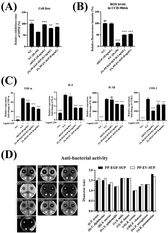 Probiotic-derived bioproperties: antioxidant, anti-inflammatory, and anti-bacterial activities. To determine whether PP-EGF-SUP exhibited probiotic-derived bioactivities, its antioxidant, anti-inflammatory, and anti-bacterial properties were confirmed using a DPPH assay, an ROS scavenging assay, cytokine expression profiling using the Q-RT-PCR method, and an anti-bacterial assay using the disk diffusion method. (A) In the DPPH assay using the cell-free system, rhEGF (10 ng/mL), 2% PP-EGF-SUP, and 2% PP-EV-SUP were tested to measure the efficacy of DPPH inhibition. The actual EGF protein content in 2% PP-EGF-SUP was 0.3 ng/mL, and 10 nmole Trolox was used as a positive control. All data are presented as the mean ± SEM of three independent experiments (n = 3). ** p < 0.001, *** p < 0.001 vs. P.C. (B) In the ROS scavenging activity assay using the CCD-986sk cell line, the cells were treated with various EGF protein concentrations, namely, rhEGF at 10 ng/mL, 2% PP-EGF-SUP, and 2% PP-EV-SUP, for 1 day, and then ROS scavenging activity was measured. The actual EGF protein content in 2% PP-EGF-SUP was 0.3 ng/mL, and 20 mM L-Ascorbic acid was used as a positive control. All data are presented as the mean ± SEM of three independent experiments (n = 3). ns, not significant; *** p < 0.001 vs. rhEGF. (C) In the anti-inflammatory activity assay using the RAW 264.7 cell line, the cells were treated with various EGF concentrations, namely, rhEGF at 10 ng/mL, 2% PP-EGF-SUP, and 2% PP-EV-SUP, for 1 day, and then the gene expression levels of inflammatory markers (COX-2, IL-1β, IL-6, and TNF-α) were measured using the Q-RT-PCR method. Furthermore, 1 g/mL lipopolysaccharide (LPS) was also used as co-treatment to induce an inflammatory reaction in the cells. The actual EGF protein content in 2% PP-EGF-SUP was 0.3 ng/mL. All data are presented as the mean ± SEM of three independent experiments (n = 3). ns, not significant; * p < 0.05, *** p < 0.001 vs. N.T. (D) In the anti-bacterial activity assay, ten species of harmful skin bacteria were treated using the disk diffusion method. The cultured strains were diluted in 1 McFarland standard equivalent cell number adjusted by approximately 3 × 108 cfu/1 mL, and then they were distributed to each dish after mixing in 9 mL of BL agar. Next, 1 mL of PP-EGF-SUP, PP-EV-SUP, and M9 media was concentrated on paper disks and then completely dried. The paper disks were placed on the different bacterial strain plates, and all plates were incubated at 37 °C for 1 day. The inhibition area (clear zone) was measured and compared with that of negative controls (N.T. and M9 media).