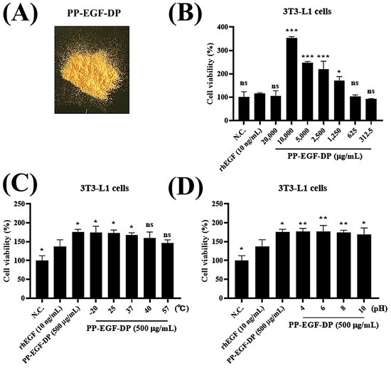 Evaluation of PP-EGF-DP as a cosmetic ingredient. (A) PP-EGF-DP was prepared following the PP-EGF-SUP powdering procedure detailed in the Materials and Methods Section. (B) To determine whether PP-EGF-DP had a stimulatory effect on fibroblast cell proliferation due to EGF-derived bioactivity, cell viability was analyzed using the MTT (WST-8) technique, and rhEGF was used as a positive control. All data are presented as the mean ± SEM of three independent experiments (n = 3). ns, not significant; * p < 0.05, *** p < 0.001 vs. rhEGF. (C) To determine the temperature stability of PP-EGF-DP, its stimulatory effects on fibroblast cell proliferation after resuspension in solution was measured using the MTT method. All data are presented as the mean ± SEM of three independent experiments (n = 3). ns, not significant; * p < 0.05 vs. rhEGF. (D) To determine the pH stability of PP-EGF-SUP, the stimulatory effect on fibroblast cell proliferation by PP-EGF-DP solution after resuspension was measured using the MTT method. All data are presented as the mean ± SEM of three independent experiments (n = 3). * p < 0.05, ** p < 0.001 vs. rhEGF.