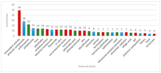 Number of occurrences of terms in the articles of the portfolio. Red color: most common terms among photoprotection studies; blue color: most common terms among studies on the extraction of bioactive compounds; green color: most common terms among studies on bioactive compounds in jaboticaba peel.