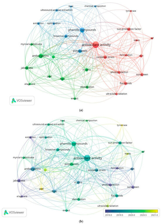 Figure 2b indicates a trend in research investigating the importance of enzyme activity and the prevention of damage caused by UV radiation, as demonstrated by the more recent relationships between the terms “tyrosinase”, “sun protection factor”, and “antioxidant activity”. According to the VOSviewer manual Eck & Waltman [12], the distance between terms represents their relationship within the studies analyzed by the software. The positioning of terms related to research on photoprotective formulations reveals a gap in studies investigating the use of extracts derived from jaboticaba peel in this type of formulation.