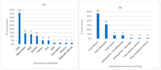 Extraction processes were applied to 55 plant species, utilizing various parts including leaves, stems, peels, pulps, seeds, and agro-industrial solid wastes. Ten distinct extraction methods were identified, each cited at least once in 56 articles from the portfolio. The most commonly used methods were ultrasound-assisted extraction (UAE) with 23 occurrences (41%), maceration with 8 (14%), agitated bed extraction (ABE) with 7 (13%), and Soxhlet with 6 (11%) (Figure 3a). The results reported in this review on ultrasound-assisted extraction with the solvent ethanol in dried jaboticaba peel corroborate the conclusions of Rosa et al. [18], who highlighted it as one of the most efficient and viable non-conventional techniques from both ecological and economic perspectives.